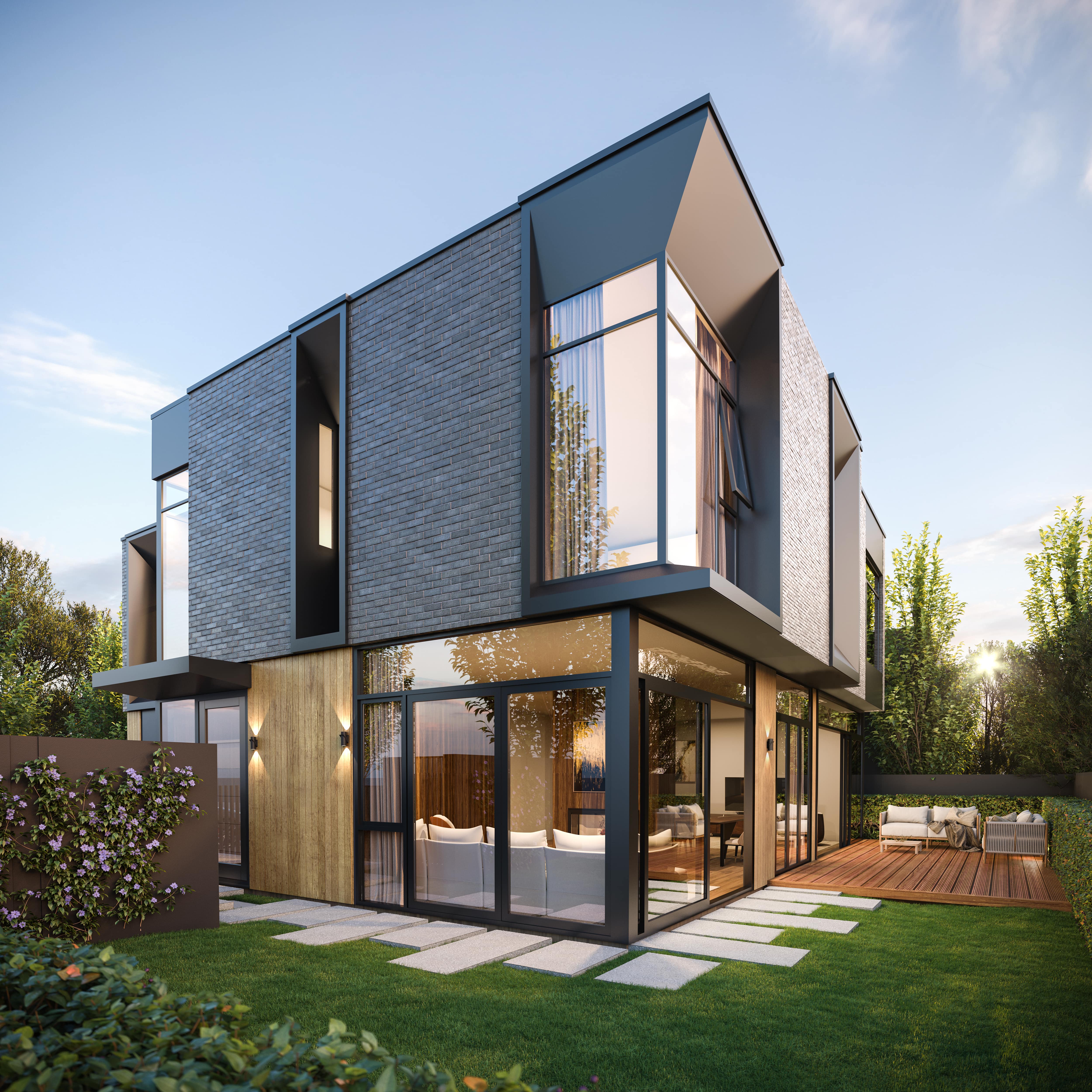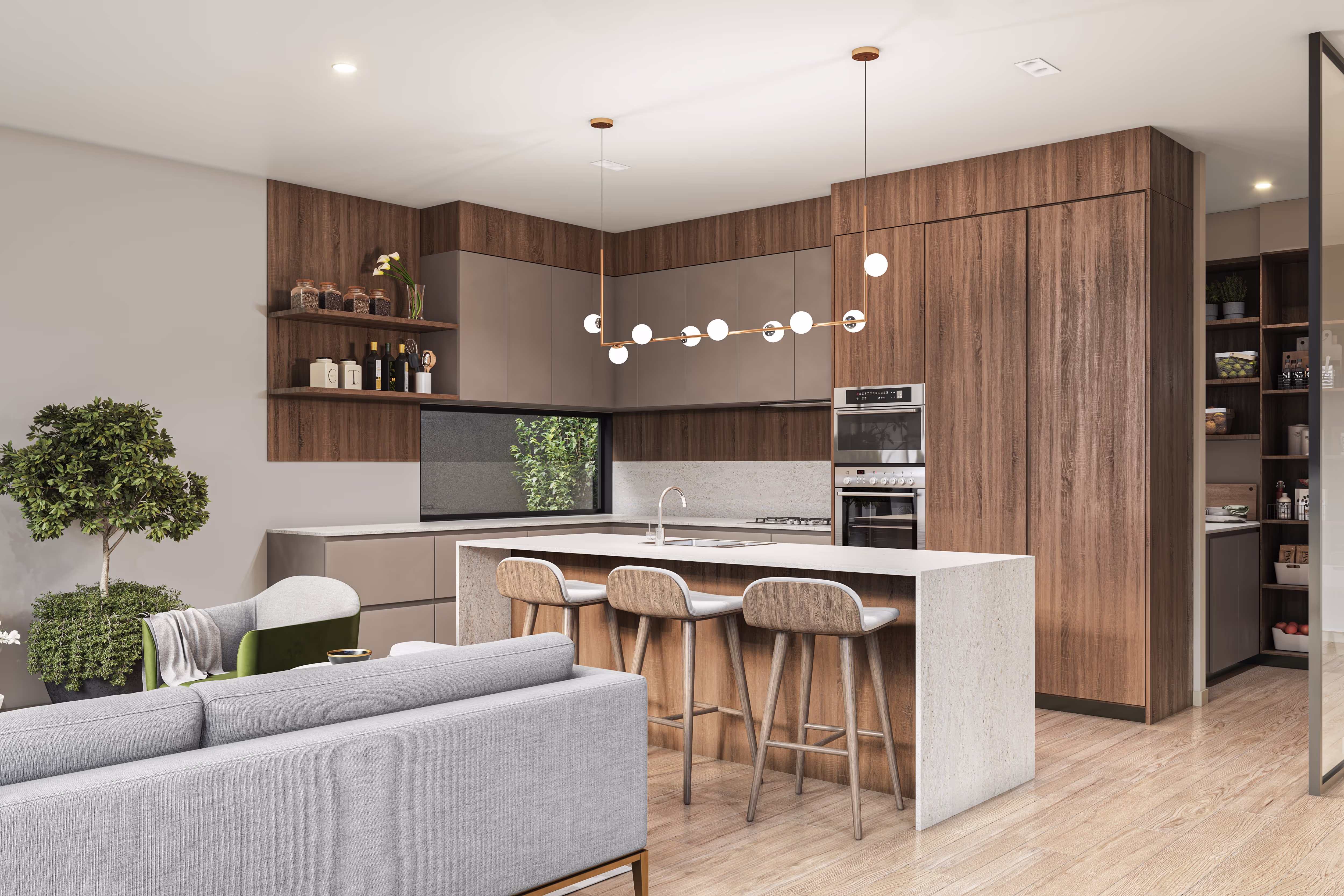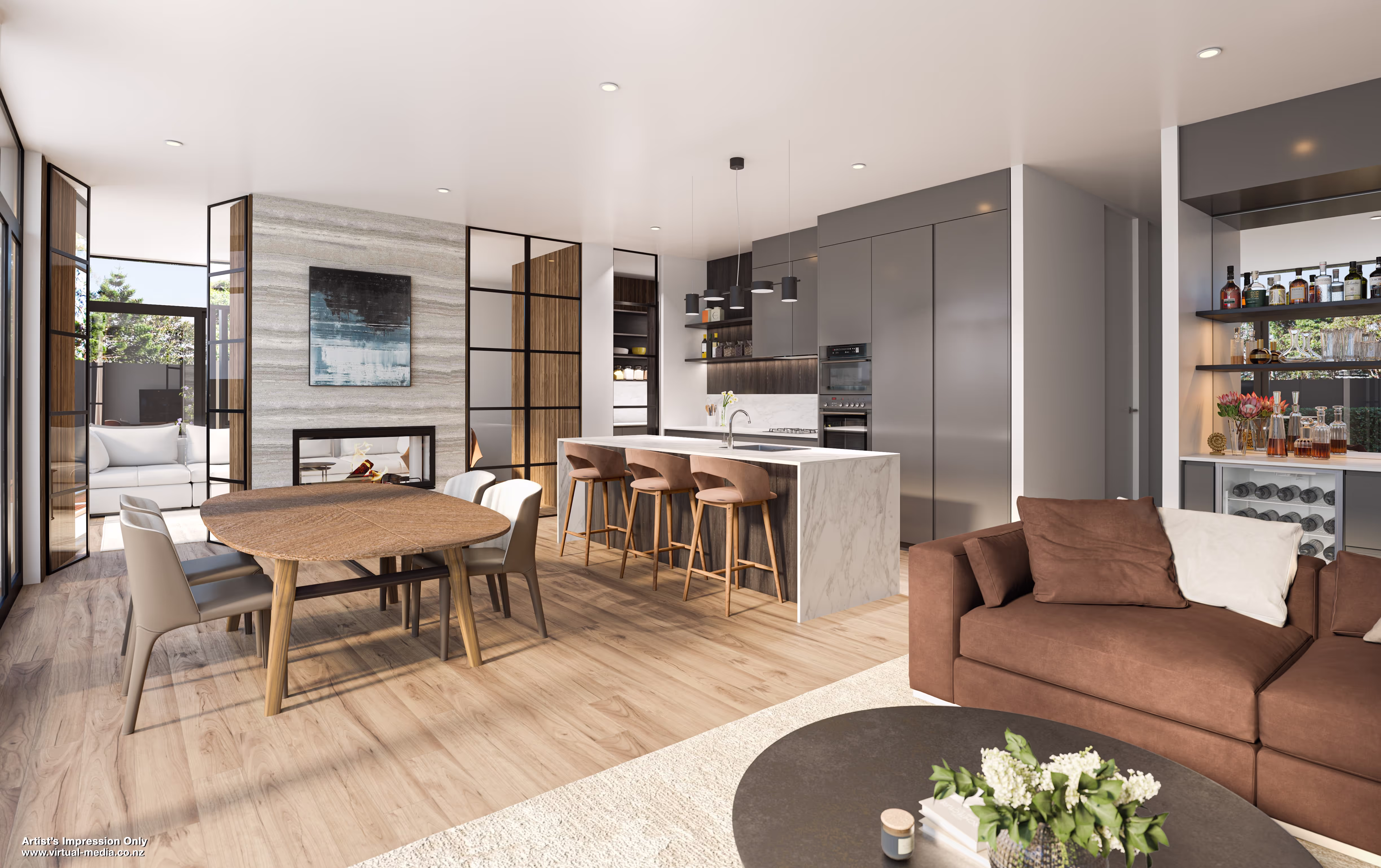 Upland’s living areas are designed to maximise light, space, and functionality. Large windows flood the open-plan spaces with natural light, creating a warm and inviting atmosphere. These lounges are perfect for both relaxed evenings and lively gatherings, offering a seamless blend of style and practicality.